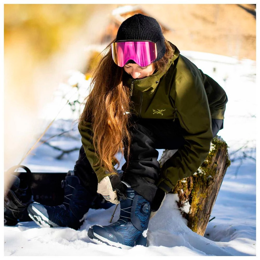 Voici la Rift en version femme de chez Nidecker, une boots ultra confort avec beaucoup d’amorti et de douceur, qui vous emmènera sur tous les terrains, qu’ils soient recouvert d’un mètre de poudre ou qu’ils soient béton. On retrouve un système de serrage double Boa qui permet de serrer indépendamment les parties hautes et basses de la botte pour un fit bien customisé et un flex intermédiaire qui donne à la botte cette polyvalence incroyable. On passera du park à la piste sans se demander si elle sera assez flex pour tirer un ou deux grabs sur le park ou si elle aura assez de répondant sur piste. La réponse est oui, quelle que soit la question. On note qu’une attention toute particulière a été mise sur le confort avec la partie orteil du chausson conçue sans aucune couture. Globalement, la chaussure est ultra légère et absorbe bien les chocs. On a plaisir à l’enfiler le matin, on sait que la journée va être bonne. Et pour couronner le tout, elle est vraiment belle !