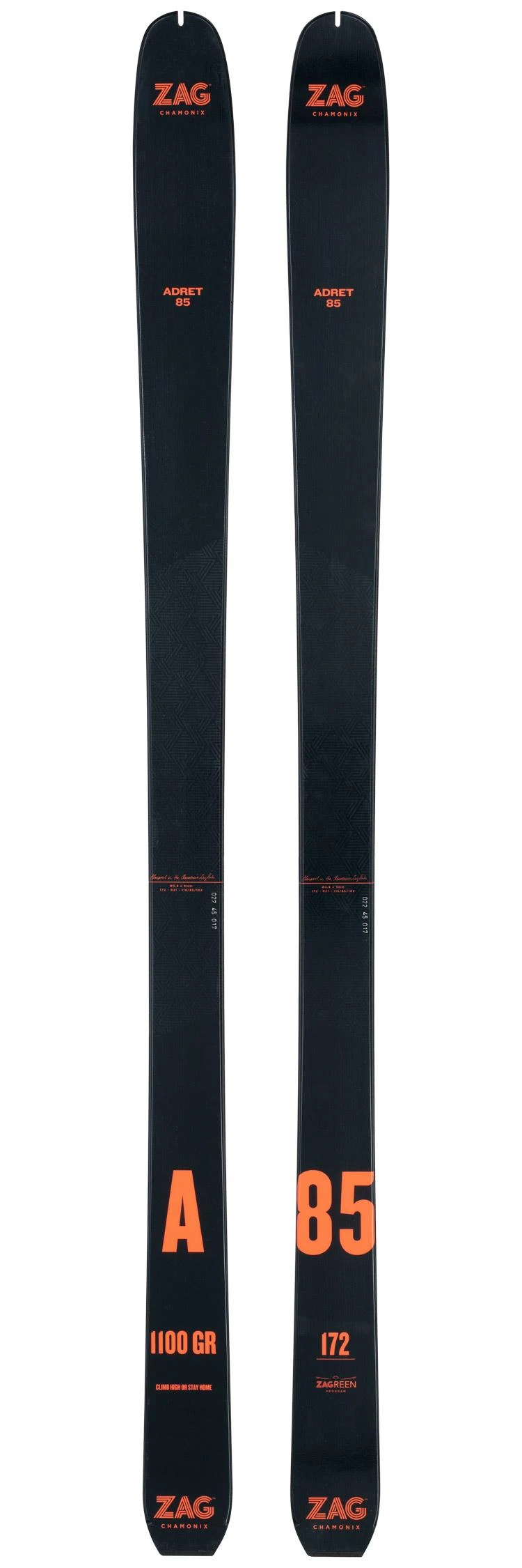 Le Zag Adret 85 est un ski de randonnée polyvalent, conçu pour les skieurs de niveau confirmé à expert qui offre un bon ratio poids/solidité. Assez léger pour assurer des ascensions rapides, assez robuste pour permettre des descentes sportives et dynamiques, il est conçu avec un noyau de bois léger combiné avec des fibres de carbone et renforcé de kevlar. Moins large que l’Adret 88, il permet néanmoins une flottaison légère sur les petites neiges et l’absence de rocker au talon lui confère une bien meilleure accroche en pente raide. Maniable et très léger, il économise l’énergie dépensée à la montée tout en permettant de se faire bien plaisir à la descente.